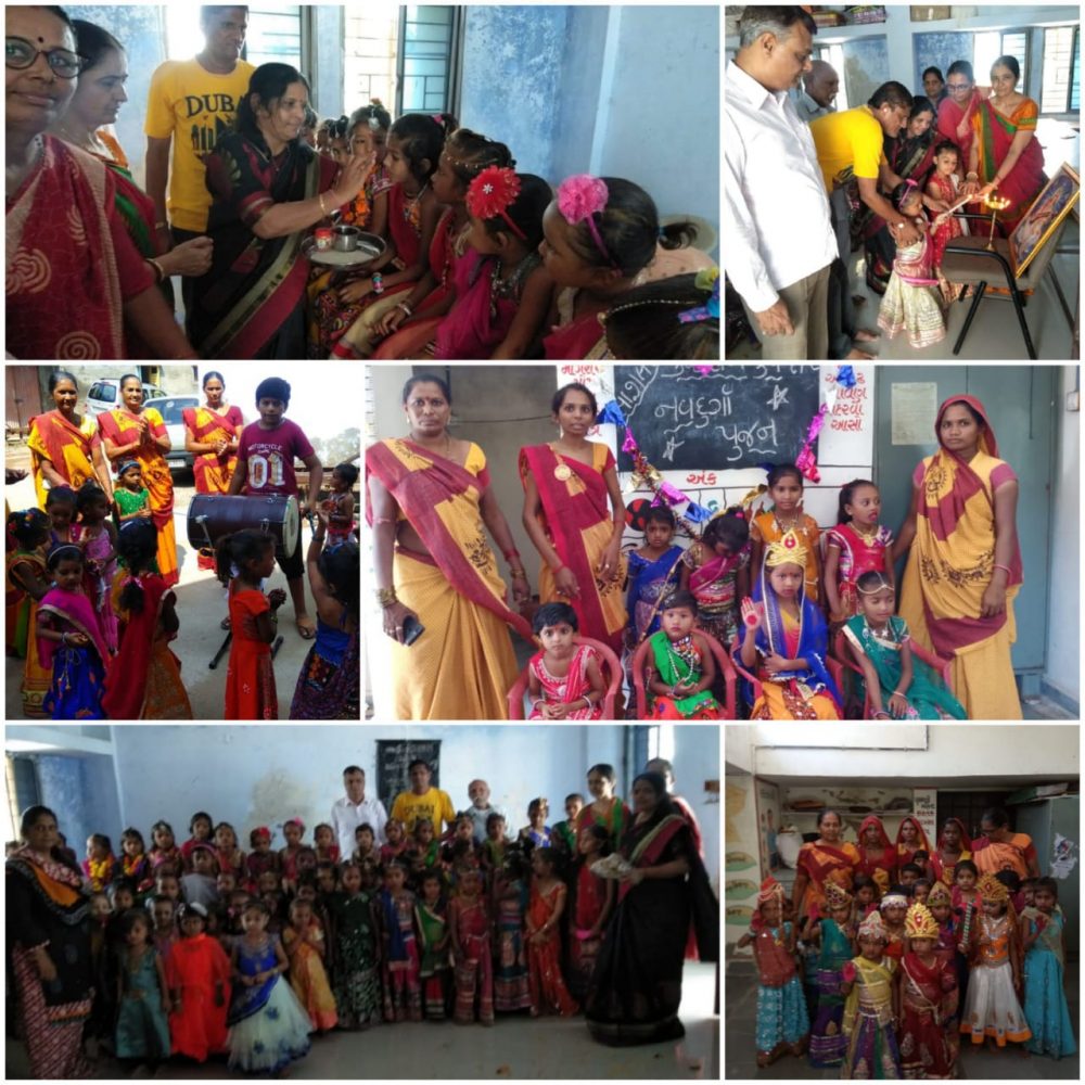 નવદુર્ગા પૂજન બાદ બાળાઓને ગીફ્ટ આપી સુખડી વિતરણ કરવામાં આવ્યું.અમદાવાદ જીલ્લાના માંડલ ઘટક માં માંડલ ની ૧ થી ૯૭ આંગણવાડી માં નવદુર્ગા પૂજન નું આયોજન કરવામાં આવ્યું હતું. માંડલ માં ઉપસ્થિત શક્તિ શરાફી સહકારી મંડળી દ્વારા કાર્યક્રમ નું આયોજન કરવામાં આવ્યું હતુ. જેમાં ચેરમેન મનુભાઈ , M.D રાજુભાઈ શાહ , મહેશભાઈ ચાવડા , નીરૂબેન ચાવડા , સી.ડી.પી.ઓ. મીતા જાની , મુખ્ય સેવિકા આયેશાબેન ઉપસ્થિત રહ્યા અને બાળાઓ ને ગીફ્ટ આપી સુખડીનું વિતરણ કરવામાં આવ્યું હતું. આ કાર્યક્રમમાં મહેશભાઈ ચાવડા એ ઉદબોધન કરી સરકારના નવતર અભિગમ પાછળ નો હેતુ કુપોષણ દુર અને બાળકીઓ માં પોષણ વધારવું તેમજ દીકરો દીકરી એક સમાન છે જે બાબતે માર્ગદર્શન પૂરું પાડેલ હતુ. આ કાર્યક્રમમાં વિશાળ સંખ્યા માં બાળાઓ સાથે આંગણવાડી વર્કર બહેનો પણ હાજર રહ્યા હતા.