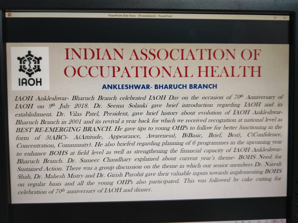 તા. ૯ જુલાઇએ IAOH દ્વારા ૭૦ વર્ષથી ઓક્યુપેશન હેલ્થ ડે ની ઉજવણી કરાય છે આ વર્ષે આ સંસ્થા દ્વારા અસંગઠીત ક્ષેત્રનાં કામદારો જેમ કે ખેતમજુરો, રોજમદારો, લારી-ગલ્લા ધારકો વગેરેની શારિરિક તપાસ અને સારવારની થીમ ઉપર આ દિવસના કાર્યક્રમની રૂપરેખા તૈયાર કરાઈ હતી. હોટલ સદાનંદ ખાતે યોજાયેલ આ કાર્યક્રમમાં IAOHનાં અંક્લેશ્વર-ભરૂચ બ્રાંન્ચનાં પ્રેસિડેન્ટ ડૉ. વિલાસ પટેલ ઉપરાંત ડૉ. સમીર ચૌધરી, ડૉ. ગિરિસ પુરોહીત, ડૉ. મહેશ મિસ્ત્રી એ દહેજથી લઈ અંક્લેશ્વર સુધીની ફેક્ટ્રીઓનાં મેડીકલ ઓફિસર્સ તથા અસંગઠીત ક્ષેત્રનાં નિષ્ણાંતોને માર્ગદર્શન પૂરૂં પાડ્યું હતું.