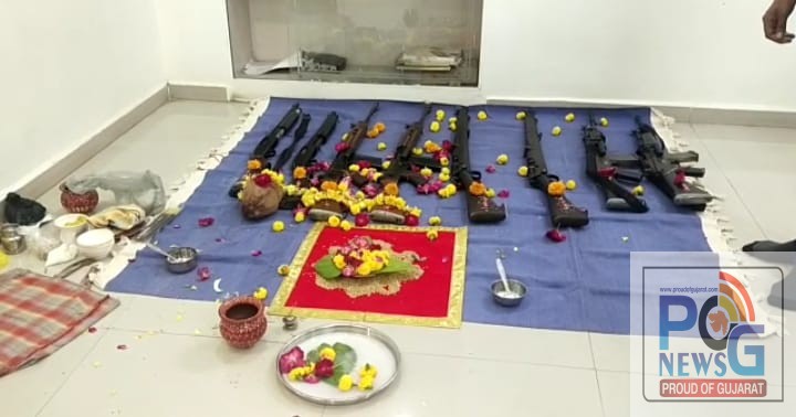 અંકલેશ્વર શહેર પોલીસ તંત્ર દ્વારા આજે ઉચ્ચ અધિકારી પી.આઈ રબારી સાહેબની હાજરીમાં પોલીસ હેડ કવાર્ટર ખાતે આધુનિક રાઈફલો સહિતનાં શસ્ત્રો તેમજ પોલીસ દળનાં વાહનોની પણ શાસ્ત્રોક્ત વિધિ સાથે ભાવભેર પુજા કરવામાં આવી હતી. આસો સુદ દશમ એટલે કે દશેરાના પર્વ નિમિતે ઠેર ઠેર શસ્ત્ર પૂજન કરીને ભક્તિભાવ પૂર્વક ઉજવણી કરવામાં આવી રહી છે. પોલીસ અધિકારીઓએ શસ્ત્રોની પૂજા કરી અને આરતી ઉતારી હતી.