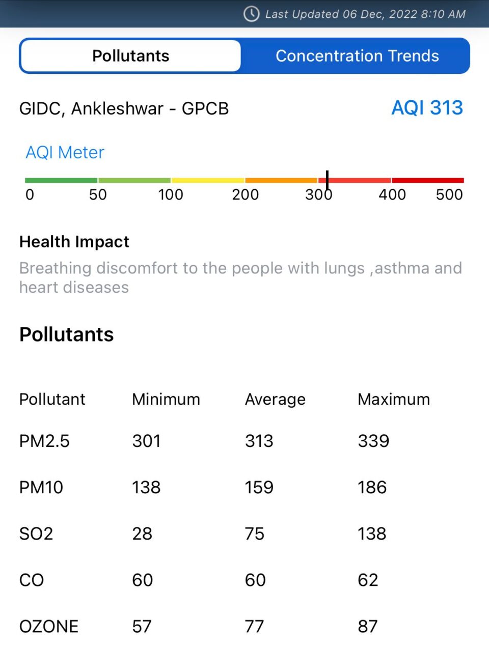 અંકલેશ્વર પંથકમાં હવાની ગુણવત્તા ખરાબ થઇ હોવાની બાબત સ્થાનિકો માટે પણ ચિંતા ઉપજાવે તેમ છે, કારણ કે આ પ્રકારના હવાની ગુણવત્તા હોય અને તેમાં પણ લાંબા સમય સુધી સંપર્કમાં રહેવાથી મોટાભાગના લોકોને શ્વાસ લેવામાં અગવડતાઓ પડી શકે છે તેમજ અન્ય રોગો પણ થઇ શકે છે તેમ પર્યાવરણવાદીઓનું માનવું છે.