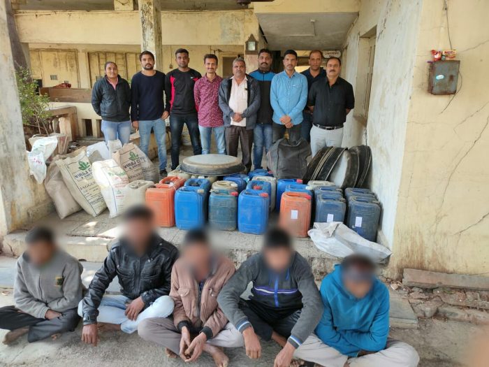 અંકલેશ્વર શહેર પોલીસ જોતી રહી અને ભરૂચ LCB પોલીસે અમરતપરા ગામની સીમમાં ખાડી ઉપર ધમધમતી દેશી દારૂની ભઠ્ઠીઓ તોડી નાંખી પાંચ બુટલેગરને ઝડપી લઈ 33 હજાર ઉપરાંતનો મુદ્દામાલ કબ્જે કર્યો હતો. અંકલેશ્વર પંથકમાં હજુ પણ દેશી વિદેશી દારૂનાં અડ્ડાઓ ધમધમી રહ્યા છે. પોલીસ રોજ બાતમીને આધારે રેડ કરે છે પરંતુ દારૂબંધીનો અમલ કરતો નથી બુટલેગરો અવનવા કીમિયા અજમાવીને દારૂનો ધંધો કરતાં હોય છે. જેમાં દેશી દારૂનાં અડ્ડા તો હજી પણ ગ્રામીય વિસ્તારમાં ધમધમે છે. ત્યારે આજે સવારે અંકલેશ્વર શહેર પોલીસ ઊંધતી રહી અને બીજી તરફ ભરૂચ LCB ની ટીમે સવાર સવારમાં અંકલેશ્વરનાં અમરતપરા ગામની સીમમાં અમરાવતી ખાડી ઉપર રેડ કરી અહીં બુટલેગરો બિંદાસ દારૂની ભઠ્ઠીઓ બનાવીને દારૂ ગાળી રહ્યા હતા. પોલીસે 9 જેટલી ભઠ્ઠીઓને તોડી નાંખી અહીંથી દેશી દારૂ 800 લિટર કિંમત રૂ.16,000 તેમજ દારૂનો વોશ 8000 લિટર કિંમત રૂ.16,000 તેમજ કેરબા વગેરે સામગ્રી મળી કુલ રૂ.33,800 નો મુદ્દામાલ કબ્જે કર્યો હતો. જયારે દારૂ ગાળતા અરૂણભાઈ વસાવા, પ્રવીણ વસાવા, ધનજી વસાવા, વાસુદેવ વસાવા, ચંદુ વસાવા તમામ રહેવાસી અમરતપરા ગામને ઝડપી લઈ અંકલેશ્વર શહેર પોલીસને હવાલે કરી તેમની સામે ફરિયાદ દાખલ કરાવી હતી.