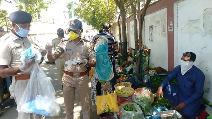 અંકલેશ્વર શહેર પોલીસની સરાહનીય કામગીરી શહેરમાં શાકભાજી વેચતા લોકોને માસ્ક અને હેન્ડ ગ્લોઝનું વિતરણ આજે કર્યું હતું.