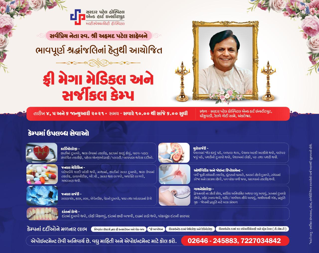 જેમના પ્રયત્નોથી અંકલેશ્વરમાં અને એમ જોવા જઈએ તો ભરૂચ જિલ્લામાં સર્વપ્રથમ સરદાર પટેલ હોસ્પિટલ અને હાર્ટ ઇન્સ્ટિટયુટ શરૂ થઈ હતી એવા સ્વર્ગીય અહેમદભાઇ પટેલના સ્મરણમાં આગામી તારીખ 4, 5 અને 6 જાન્યુઆરી દરમ્યાન હોસ્પિટલ ખાતે વિનામૂલ્યે મેગા કેમ્પનું આયોજન કરવામાં આવ્યું છે.