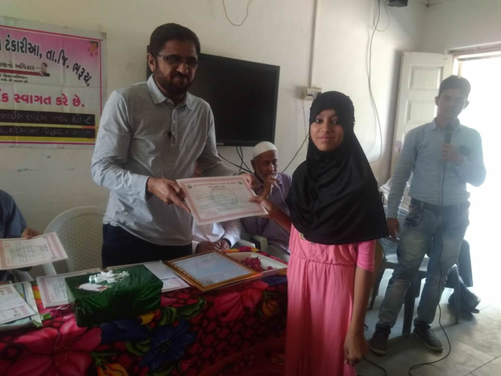 ક્ષમતા કસોટીમાં ઉત્તીર્ણ થયેલા છાત્રોનો પ્રમાણપત્ર વિતરણ કાર્યક્રમ જુદા જુદા ગામોમાં સમાજના અગ્રણી આગેવાનોના હસ્તે યોજાયો હતો. જેમાં ટંકારીયામાં પૂર્વ આચાર્ય અને પૂર્વ જિલ્લા પંચાયતના સદસ્ય સઈદ બાપુજી અને યુસુફભાઈ જેટ હસ્તે, સીતપોણમાં હાઈસ્કુલના આચાર્ય નશીમાબેન અને બસીરભાઈ આકુબતના હસ્તે, પારખેતમાં ઈખર હાઈસ્કૂલના અધ્યક્ષ ઈબ્રાહીમભાઈ અને ઈખર હાઈસ્કૂલના આચાર્ય સાદીકભાઈના હસ્તે, કહાન અને સેગવા ગામે કહાનના પૂર્વ સરપંચ દાઉદભાઈ અને અગ્રણી મુસ્તાકભાઈ બાબાસીના હસ્તે, કંથારિયામાં હાઈસ્કૂલના આચાર્ય સૈયદ પીરજાદા અને દેરોલ હાઈસ્કૂલના આચાર્ય જાવીદ મલેકના હસ્તે અને નબીપુરમાં હાઈસ્કૂલના આચાર્ય નસીમબેન પટેલના હસ્તે છાત્રોને પ્રમાણપત્ર એનાયત કરાયા હતા.