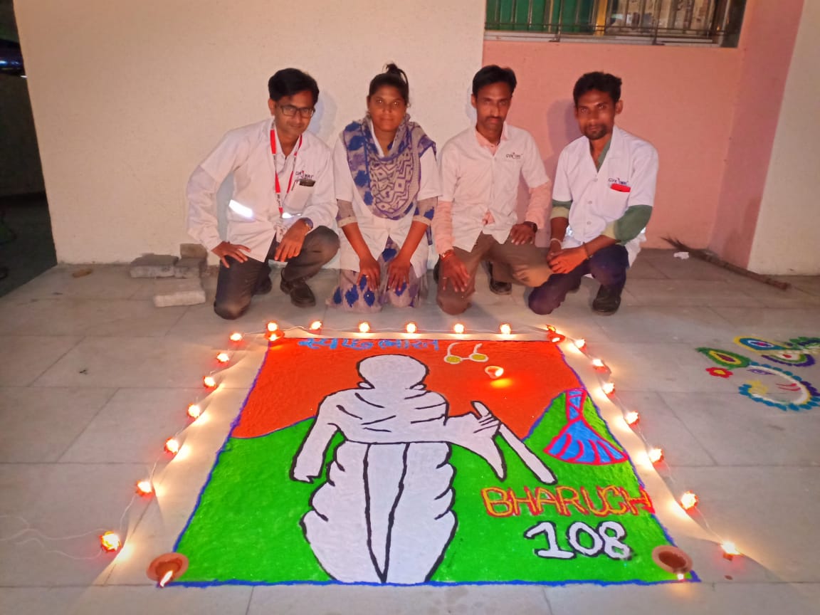 ભરૂચ ૧૦૮ ઇમરજન્સી સેવાની ટીમના સભ્યોએ દિવાળી નિમિત્તે સિવિલ હોસ્પિટલના પટાંગણમાં મહાત્મા ગાંધીજીની સુંદર રંગોળી બનાવી.