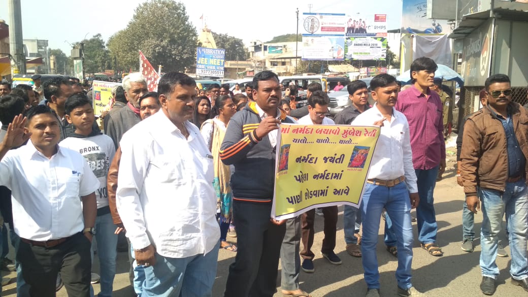 ખોડલધામના ટ્રસ્ટી અને અગારેશ્વરના મહેશ પરમારની આગેવાનીમાં શક્તિનાથ સર્કલ થી કલેકટર કચેરી સુધી રેલી યોજાઈ હતી અને ત્યાર બાદ આવેદન પત્ર પાઠવાયું હતું આવેદનપત્રમાં જણાવાયું છે કે નર્મદા જ્યંતી નિમિત્તે નર્મદાને ૩૦૦ મીટર ની ચૂંદડી અર્પણ કરાય છે પરંતુ પાણી સુકાતા આ રિવાજ પૂર્ણ નથતા ધાર્મિક આસ્થા દુભાઈ છે આવનાર તા ૧૨ મી ના રોજ નર્મદા જ્યંતી છે તેથી નદીમાં પાણી છોડવા વિંનતી જેથી ચૂંદડી અર્પણ કરી શકાય ભરૂચ નગર ના અસ્તિત્વ સાથે મનર્મદા સંકળાયેલ છે તેથી અને પાણી સુકાતા નદી કિનારાના ગામોમાં દીપડા અને અન્ય હિંસક પ્રાણીઓના હુમલા વધ્યા છે તેથી નદીમાં પાણી છોડવા વિંનતી કરવામાં આવી છે વન વિસ્તાર નાસ પામી રહ્યો છે માછીમારો ની આજીવિકા છીનવાઈ રહી છે સિંચાઇના અભાવે ફૂલોની ખેતી નાસ પામી રહી છે ઝનોર અને નાદ વિસ્તારમાં ખેડૂતોના પમ્પોમાં પાણી ન આવતા ખેતીને ફટકો પડેલ છે આબધા કારણોસર નર્મદાનદીમાં નીર છોડવાની માંગ કરવામાં આવી છે