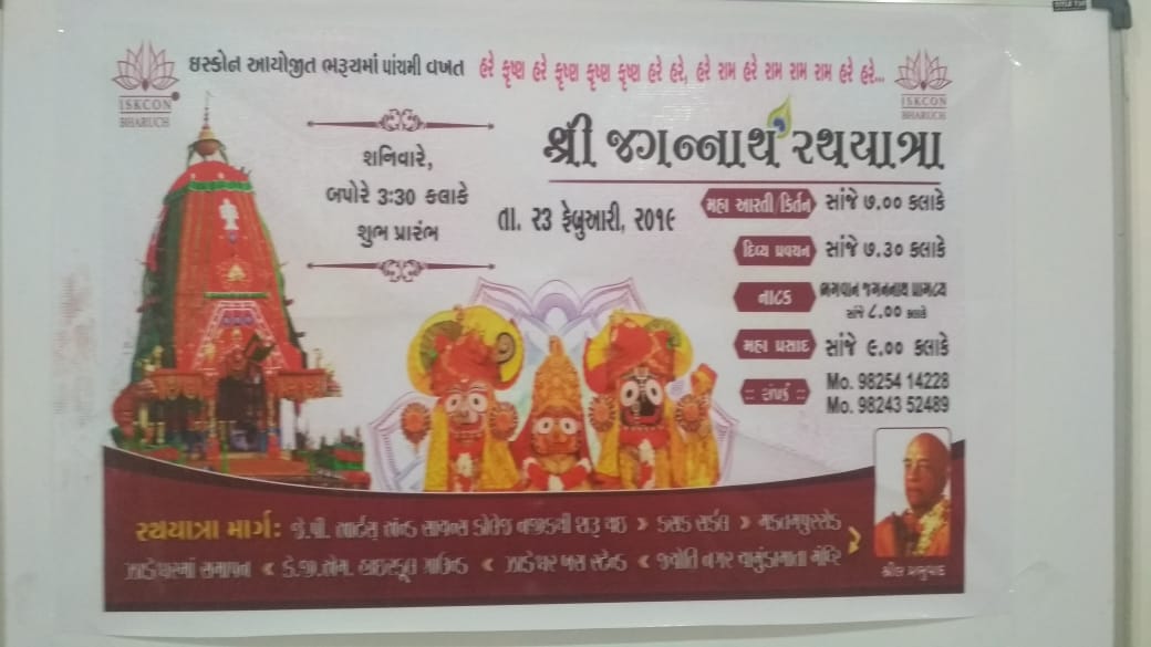 ઇસ્કોનની રથયાત્રા તારીખ 23-02-2019ના શનિવારે હરિ પેટ્રોલપંપ કોલેજ રોડ થી બપોરે ૩ વાગે શરૂ થઇ ઝાડેશ્વર થઇ કે.જી.એમ હાઇસ્કુલ ગ્રાઉન્ડ ખાતે પહોંચશે ત્યાં ભજન-કીર્તન ભગવાન જગન્નાથના પ્રાગટ્ય પર અદભૂત નાટક પ્રવચન દર્શનના કાર્યક્રમ યોજાશે એમ વામનદેવ દાસ(વિરલ પટેલ) ઇસ્કોન ભરૂચ અધ્યક્ષે જણાવ્યું હતું.