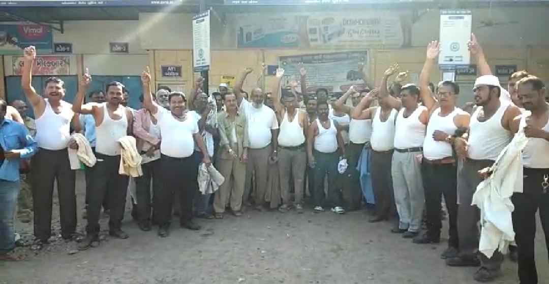એસ.ટી.કર્મચારીઓની હડતાળ બીજા દિવસે પણ યથાવત રહી હતી.વિવિધ પડતર માંગણીઓ સાથે એસ.ટી ના કર્મચારીઓએ અધનગ્ન બની સરકાર સામે વિરોધ નોંધાવ્યો હતો.તેમજ એસ.ટી.ડેપોના પ્રવેશ દ્વાર પર બસ આડી મૂકી ખાનગી બસ અંદર આવતા અટકવાઈ હતી.સાથે જ કર્મચારીઓએ ભારે સૂત્રોચ્ચાર કર્યા હતા.તો બીજી તરફ એસ ટી બસો ની સતત બે દિવસ થી ચાલી રહેલ હડતાળ ના પગલે અનેક મુસાફરો અટવાયા હતા.જેમાં ગામોમાંથી શહેરી વિસ્તારમાં ભણતર માટે આવતા અને નોકરિયાત વર્ગને ભારે મુશ્કેલીઓનો સામનો કરવો પડ્યો હતો.