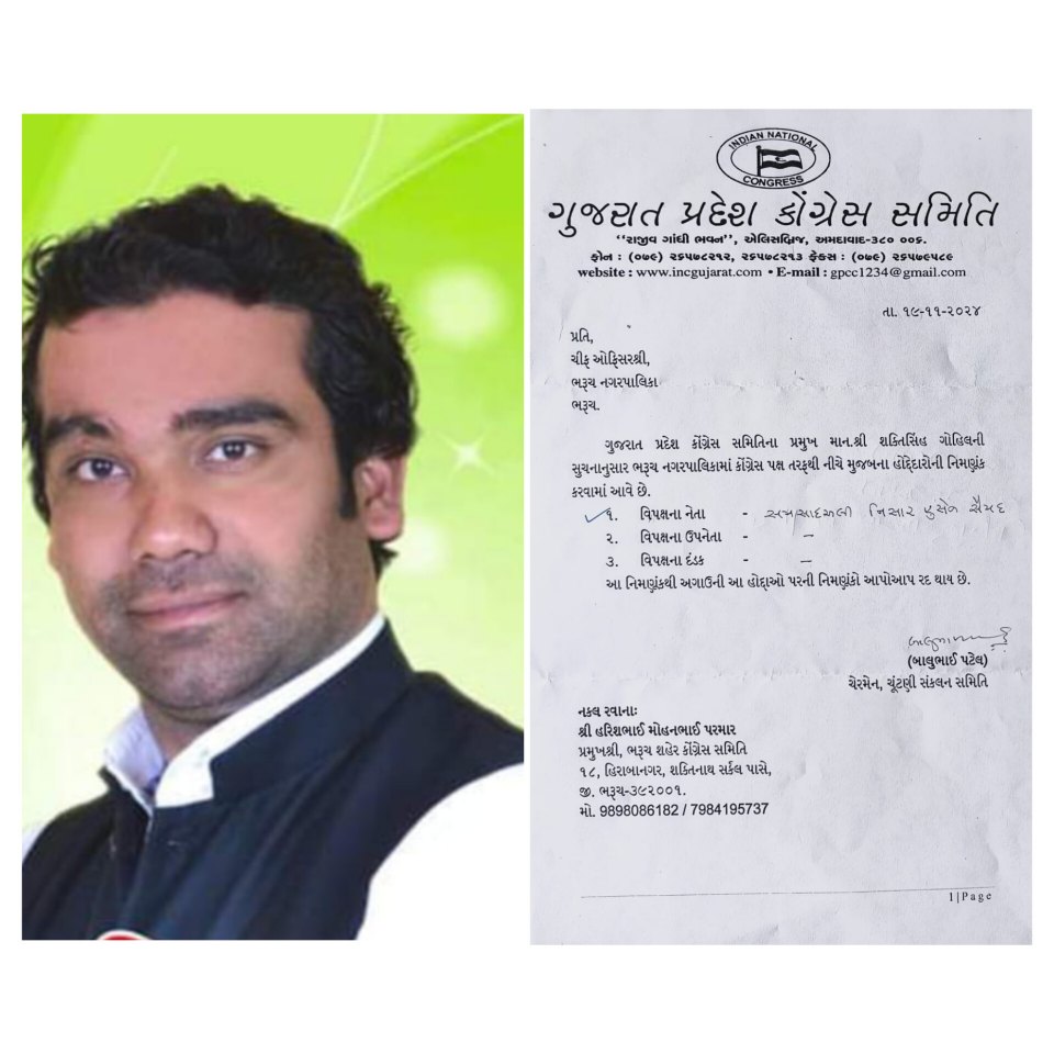 ભરૂચ નગર પાલિકાનાં વિપક્ષના નેતા તરીકે સમશાદ અલી સૈયદ ત્રીજી વાર ચૂંટાયા છે. પાછલી બે ટર્મમાં સત્તાના સામા વહેણે લોક હિતના પ્રશ્નો માટે લડત લડતા સમશાદ અલી સૈયદ પર સાથી સભ્યોએ ફરી એકવાર ભરોસો મુક્યો છે. પ્રદેશ કોંગ્રેસ કાર્યલય ખાતે વિપક્ષના તમામ સભ્યોએ એક સૂરમાં વિપક્ષ નેતા તરીકે સમશાદ સૈયદને યથાવત રાખવાનો મત દર્શાવતા તેમની બિન હરીફ વરણી થઈ છે.