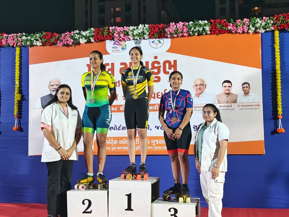 ભરૂચની ઊભરતી સ્કેટિંગ સ્ટાર પ્રાત્વી દેસાઈએ પોતાની રમતગમતની ક્ષમતાનું ઉત્કૃષ્ટ પ્રદર્શન કરતા સુરત ખાતે યોજાયેલ રાજ્ય કક્ષાના ‘ખેલ મહાકુંભ’માં બે બ્રોન્ઝ મેડલ જીતીને ઝળહળતી સફળતા પ્રાપ્ત કરી છે.