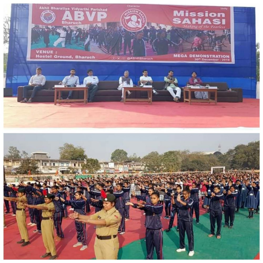 મિશન સાહસી કાર્યક્રમ હેઠળ અખિલ ભારતીય વિદ્યાર્થી પરિષદ દ્વારા 8 દિવસમાં ભરૂચની કોલેજો તેમજ વિવિધ શાળાઓની 5500 વિદ્યાર્થીઓને સ્વરક્ષણની તાલીમ અપાઈ હતી. જેનું સોમવારે રાજયકક્ષના મંત્રી ઇશ્વરસિંહ પટેલ, ભાજપ પ્રદેશ મહામંત્રી ભરતસિંહ પરમાર, એ.બી.વી.પી. ના પ્રદેશ સંગઠન મંત્રી અશ્વિની શર્મા, ફિલ્મ અભિનેતા ચેતન ધનાની, પાલિકા પ્રમુખ સુરભીબેન તમાકુવાળા સહિતની ઉપસ્થિતિમાં નિદર્શન કરાયું હતું. તાલીમ મેળવેલી 5500 છાત્રાઓ પૈકી 2000 જેટલી યુવતીઓએ શહેરના હોસ્ટેલ ગ્રાઉન્ડ ઉપર 2 કલાક સુધી સ્વરક્ષણના વિવિધ દાવપેચ બતાવી અન્ય છાત્રાઓ સહિત ઉપસ્થિતઓને મંત્રમુગ્ધ કરવા સાથે તેઓમાં પણ સેલ્ફ ડિફેન્સના પાઠ શીખવાનો ક્રેઝ ઉભો કર્યો હતો. યુવતીઓએ દાંતથી 1900 કિલોની કારને ખેંચવી, ઝુડો, કરાટે સહિતના દાવપેચ રજૂ કરી આજના સાંપ્રાંત સમયમાં યુવતીઓ માટે સ્વરક્ષણ કેટલું આવશ્યક હોવાનો ચિતાર શક્તિ પ્રદર્શન થકી ઉજાગર કર્યો હતો.