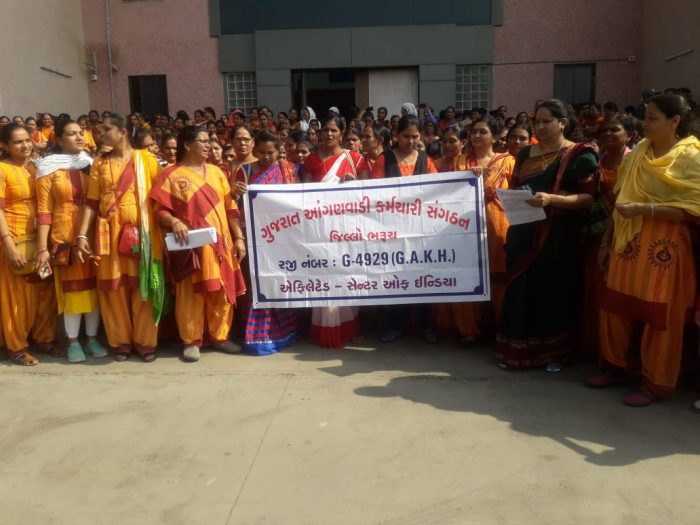 રાજયભરની આંગણવાડી કેન્દ્રનાં સંચાલિકા બહેનોને કામગીરી કરતાં ઓછો પગાર અને ઉપલા અધિકારીઓ દ્વારા આપવામાં આવતા માનસિક ત્રાસ સહિત દિવસભર થકવી નાંખતી કામગીરી, રોજ સેલ્ફીથી હાજરી સહિત અનેક કામગીરી કરતી હોવા છતાં ઉપલા અધિકારીઓ કામગીરી નથી કરતાનાં ઠપકા સહિત કુપોષણ મામલે અપાતા ઠપકા બાદ પણ આંગણવાડી કેન્દ્રની બહેનો દ્વારા કામગીરી કરવા છતાં પગાર વધારો આપતા નથી. ત્યાં આજે ભરૂચની આંગણવાડી કેન્દ્રની બહેનો દ્વારા ગુજરાત આંગણવાડી કર્મચારી સંગઠનના નેજા હેઠળ જીલ્લા પ્રમુખ રાગિણીબેન સાથે જીલ્લા નાયબ કલેકટરને આવેદનપત્ર આપવામાં આવ્યું હતું જેમાં માંગણી કરવામાં આવી હતી કે આઇ.સી.ડી.એસ નું સીધું કે આડકતરું ખાનગીકરણ બંધ કરો તમામને 21000 લધુત્તમ પગાર આપો, લધુત્તમ પેન્શન આપો, આંગણવાડી વર્કર અને હેલ્પરને લધુત્તમ વેતનનાં શિડયુલમાં સમાવેશ કરો, કાયમી દરજજો આપી 21 હજાર પગાર આપો. દેશનાં અન્ય રાજ્યોમાં જે પગાર આપે છે તેટલો પગાર આપો, સુપરવાઈઝરમાંથી મુખ્ય સેવીકા અને હેલ્પરમાંથી વર્કરમાં પ્રમોશન કેન્દ્રમાં આપો, મીની આંગણવાડીને ફુલટાઈમ આંગણવાડીમાં પરિવર્તન કરો, વન ટાઈમ જીલ્લા તાલુકા ફેરબદલી આપતો હુકમ કરો, બાળકોને અપાતાં ફળફળાદી, શાકભાજી, મસાલામાં ભાવવધારો આપો તેમજ પેન્શન આપો, પ્રોવિડન્ડ ફંડ, ગ્રેચ્યુઈટી, ઇ.એસ.આઇનો લાભ આપો સાથે મોબાઈલ ફોન ઉપર ડેટા મૂકવાનો આદેશ પાછો ખેંચો તેવી માંગણી કરી હતી.