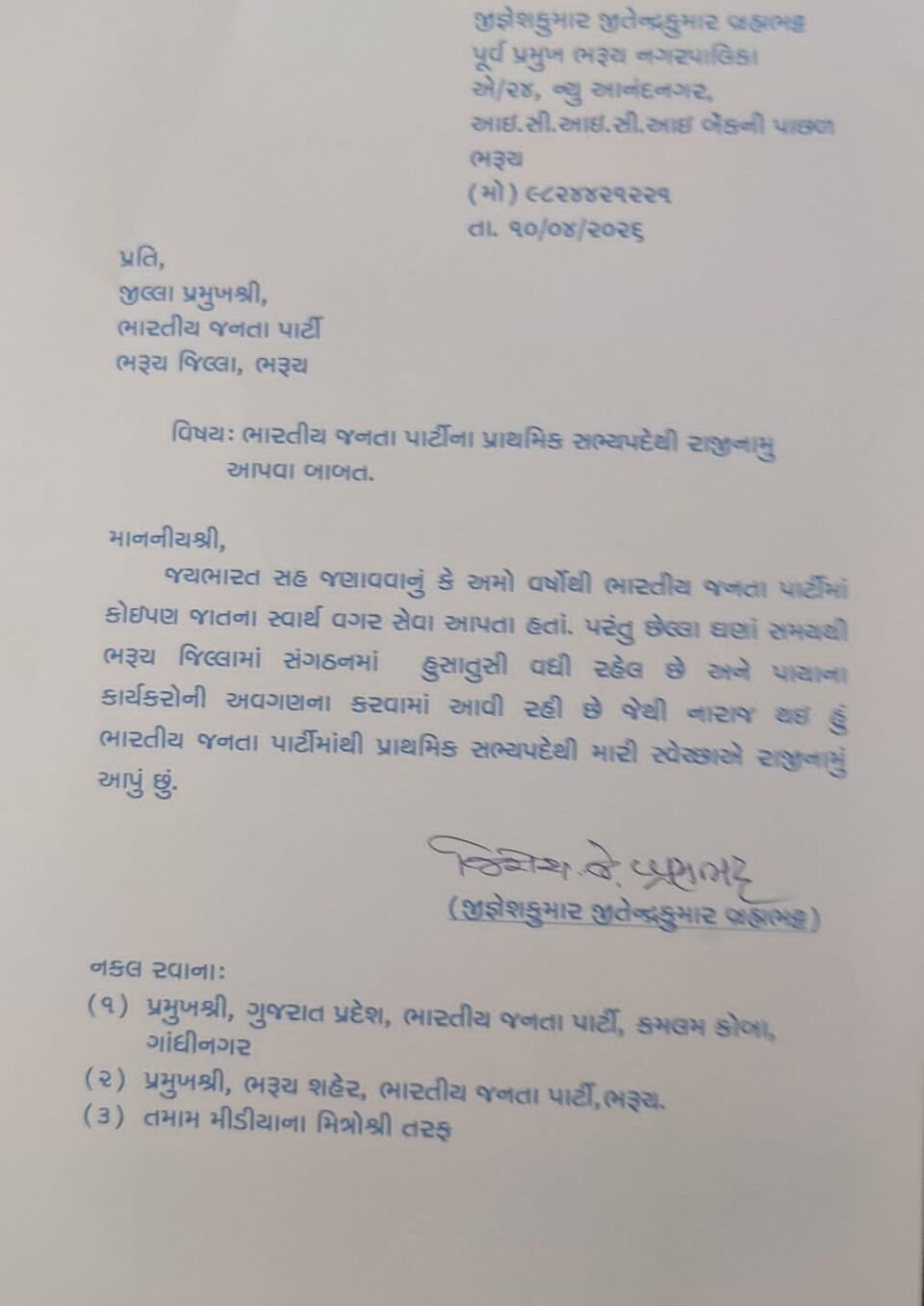 ભરૂચ શહેરના રાજકારણમાં મહત્વપૂર્ણ વળાંક આવ્યો છે. પ્રયોશા ટુર્સ એન્ડ ટ્રાવેલ્સના માલિક અને ભાજપના સક્રિય કાર્યકર જીગ્નેશભાઈ બ્રહ્મભટ્ટે વોર્ડ નંબર 8 માટે ટિકિટ ન મળતા જિલ્લા પ્રમુખને પોતાનું રાજીનામું સોંપતા રાજકીય માહોલ ગરમાયો છે.