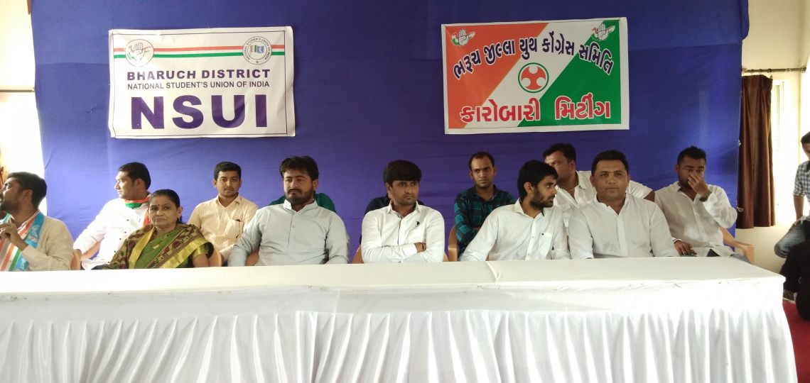 આજ રોજ ભરૂચ શહેર ના રાજપૂત છાત્રાલય ખાતે પ્રદેશ NSUI ના પ્રમુખ મહિપાલસિંહ ગઢવીની હાજરી માં ભરૂચ જિલ્લા યુવા કૉંગ્રેસ ની કારોબારી તેમજ ભરૂચ જિલ્લા એન.એસ.યુ.આઈ ના જિલ્લા પ્રમુખ ની વરણી કરવામાં હતી..આ પ્રસંગે ભરૂચ જિલ્લાયુથ કોંગ્રેસ ના પ્રમુખ શેરખાન પઠાન તેમજ યુવા કાર્યકરો અને હોદ્દેદારો મોટી સંખ્યામાં ઉપસ્થિત રહ્યા હતા..અને એન એસ યુ આઈ ના નવ નિયુક્ત વરણી કરવાની તજવીજ હાથધરી હતી