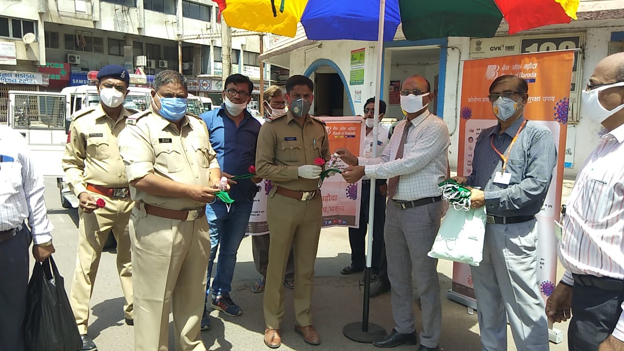 સમગ્ર દેશમાં હાલ કોરોના વાયરસને લઇ હાહાકાર મચ્યો છે. ગુજરાતમાં પણ એક બાદ એક કોરોના વાયરસના પોઝીટિવ કેસોમાં વધારો નોંધાઇ રહ્યો છે. આવી મહામારી વચ્ચે ફરજ બજાવતા પોલીસ કર્મીઓની વહારે અનેક સામાજિક સંસ્થાઓ આવી રહી છે. ભરૂચ શહેરમાં બેન્ક ઓફ બરોડા દ્વારા તાપમાં ફરજ બજવતા પોલીસ કર્મીઓ માટે માસ્ક, સેનેટાઈઝર બોટલ, છત્રી વિતરણ કરી કોરોના મહામરીમાં ફરજ બજાવવા બદલ ગુલાબ અર્પણ કરાયા હતા. શહેરના અલગ અલગ પોઇન્ટ ઉપર પોલીસ કર્મીઓને વિતરણ કરાયું હતું. આ પ્રસંગે બેન્ક ઓફ બરોડાના અધિકારીઓ તેમજ પોલીસ અધિકારીઓ સહિત નાઓ ઉપસ્થિત રહ્યા હતા.