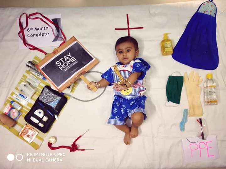 ભરૂચ જિલ્લા નર્સિંગ એસોસીએશનનાં આગેવાન દ્વારા તેમના છ મહિનાનાં બાળક દર્શ પટેલને મૂકીને તેની આસપાસ કોરોના સંક્રમણથી બચવાની વસ્તુ મૂકી આ સંક્રમણથી બચવા માટેની થીમ તૈયાર કરી.