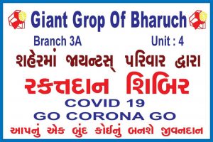 તા.૪-૫-૨૦૨૦ નાં રોજ જાયન્ટસ ગ્રુપ ઓફ ભરૂચ બ્રાન્ચ ૩A, યુનિટ-૪ દ્વારા એક રક્તદાન શિબિરનું આયોજન સેવાશ્રમ ખાતે આવેલ રેડ ક્રોસ બ્લડ બેંકમાં કરવામાં આવ્યું હતું. જાયન્ટસ ગ્રુપનાં સભ્યો તેમજ અન્ય રક્તદાતાઓએ પણ આ શિબિરમાં રક્તદાન કરી દેશ પ્રત્યેની ફરજ અદા કરી હતી. આ શિબિરમાં ૬૫ (65)જેટલા બ્લડ યુનિટ એકત્રિત કરવામાં આવ્યા હતાં. લોકોએ ઉત્સાહભેર આ શિબિરમાં ઉપસ્થિત રહી સભ્યોનો ઉત્સાહ વધારી સંસ્થાની ગરિમાને ઉજાગર કરી હતી.ગ્રુપનાં પ્રમુખ જગદીશ ભાવસારને અન્ય સભ્યોએ હાજર રહી તેમના ઉત્સાહને બેવડાવ્યો હતો.આ પ્રસંગે ધારાસભ્ય દુષ્યંત પટેલ ખાસ ઉપસ્થિત રહી જાયન્ટસ ગ્રુપનાં આ કાર્યને બિરદાવી ભવિષ્યમાં આવા સમાજ ઉપયોગી કાર્યો કરવા જ્યાં જરૂરત હોય ત્યાં હાજર રહેવાનું આશ્વાસન આપ્યું હતું. રેડ ક્રોસ બ્લડ બેંકના ડૉ. ખિલવાણી તેમજ તેમનાં સ્ટાફે આ શિબિરમાં સેવા બજાવી તેમની ફરજ અદા કરી હતી. સમગ્ર દિવસ દરમ્યાન રક્તદાતાઓ તેમના અનુકુળ સમયે આવીને રક્તદાન કર્યું હતું.