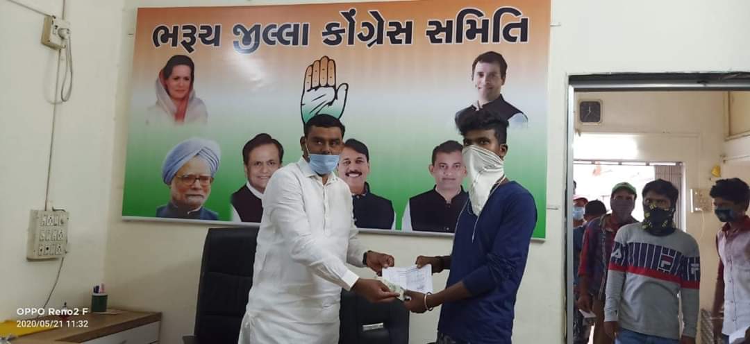 લોકડાઉનની સ્થિતિમાં ભરૂચ જિલ્લાનાં અલગ અલગ વિસ્તાર ફસાઇ ગયેલા અને વતન જવા માંગતા શ્રમિકોને જિલ્લા કોંગ્રેસ સમિતિ કાર્યાલય ખાતેથી સતત ટીકીટ દર અને ફૂડ પેકેટ માટેના રૂપિયાનું વિતરણ કરવામાં આવી રહ્યું છે,વ્યક્તિ દીઠ ૬૫૦ રૂપિયા શ્રમિકોને જિલ્લા કોંગ્રેસ કાર્યાલય ખાતેથી મળી રહ્યા છે.