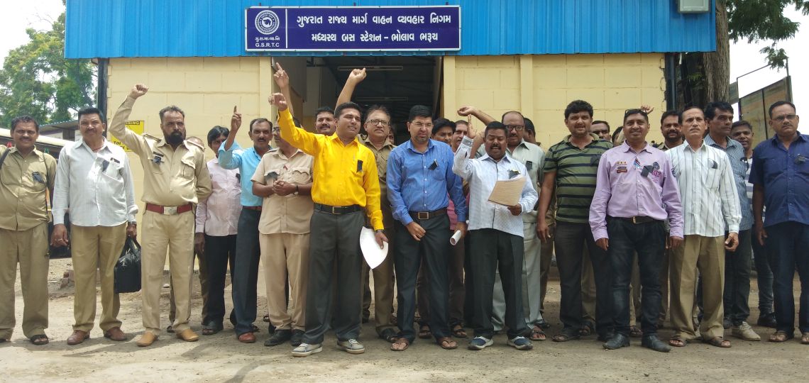 ::-આજ રોજ ભરૂચ ના ભોલાવ વિસ્તારમાં આવેલ એસ ટી નિગમના અધિકારીઓ તેમજ કર્મચારીઓએ પડતર માંગણીઓ ને લઇ વિરોધ નો સુર ઉઠાવ્યો હતો..વર્ગ ૧ થી ચાર સુધીના તમામ અધિકારીઓ કર્મચારીઓને સાત માં પગાર પંચનો લાભ જાન્યુઆરી ૨૦૧૬ થી મળે તેમજ ડ્રાઈવર તેમજ કંડકટર ને વર્ગ ત્રણ ની કક્ષા માં આવતા હોય તે મુજબ નો પગાર ધોરણ તેમજ અન્ય મળવા પાત્ર તમામ લાભો આપવામાં આવે તેવી માંગ કરી હતી….