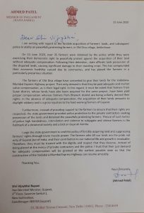 અંકલેશ્વરનાં જુના દિવા ગામે, શાંતિપૂર્ણ રીતે વિરોધ કરી રહેલા ખેડુતોની જમીનનાં બળજબરીપૂર્વક સંપાદન અને ત્યારબાદ પોલીસ બર્બરતાનાં સંદર્ભમાં રાજ્યસભા સાંસદ અહમદભાઈ પટેલે મુખ્યમંત્રીશ્રીને પત્ર લખી ગંભીર ચિંતા વ્યક્ત કરી.