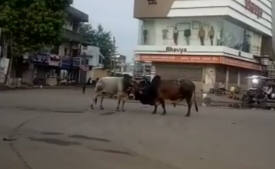ભરૂચ શહેરનાં શક્તિનાથ સર્કલ નજીક બે આખલાઓ જાહેરમાં યુદ્ધે ચડતાં લોકોના જીવ તાળવે ચોંટયા હતા.