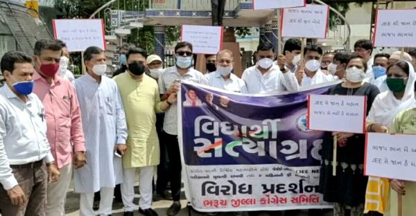 કોંગ્રેસનાં આગેવાનો અને કાર્યકરો દ્વારા પાટિયા અને બેનરો સાથે સડક પર ઉતરી આવ્યા હતા. સૌના હાથમાં કેન્દ્ર સરકારનાં વિરોધમાં સૂત્રોનાં પાટિયા જણાતા હતા. આ સાથે પ્રચંડ સૂત્રોચ્ચાર કરવામાં આવ્યા હતા. JEE અને NEET પરીક્ષા અંગે સરકાર દ્વારા લેવાયેલ નિર્ણયનો ભરૂચ જીલ્લા કોંગ્રેસ સમિતિ દ્વારા તેનો વિરોધ કરવામાં આવ્યો હતો. આ વિરોધ પ્રદર્શન અંગે ભરૂચ જીલ્લા કોંગ્રેસ સમિતિનાં પ્રમુખ પરિમલસિંહ રણાએ જણાવ્યુ હતું કે કોરોના મહામારીનાં યુગમાં આવી પરીક્ષાઓ યોજવી એ બાળકોનાં સ્વાસ્થ્ય સાથે ચેડા કરવા સમાન છે.