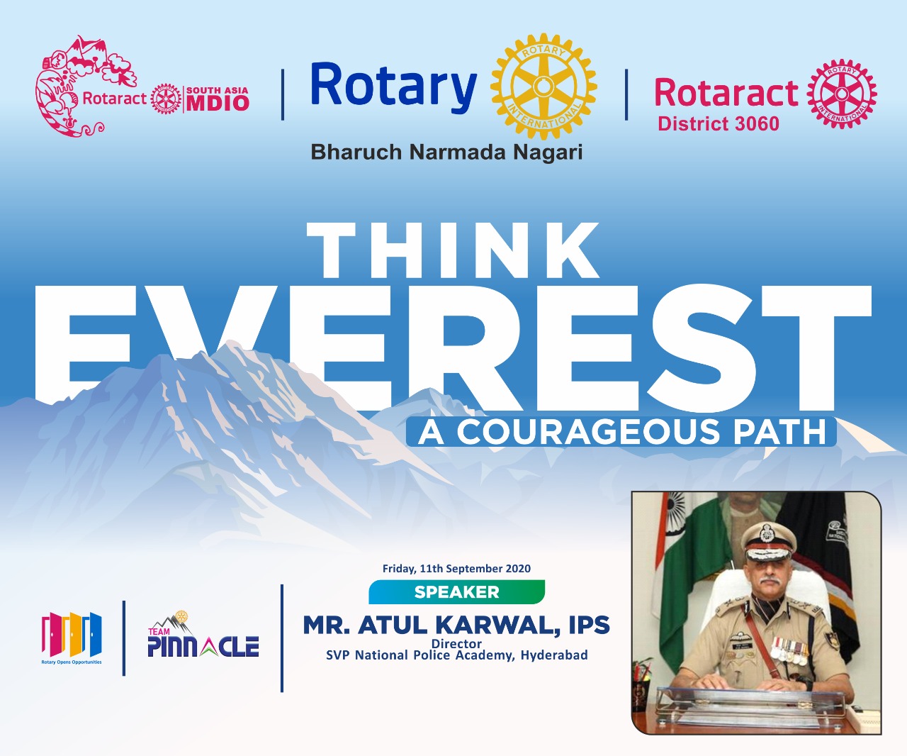 તારીખ ૧૧ સપ્ટેમ્બર,૨૦૨૦ના રોજ રોટરી ક્લબ ઓફ ભરૂચ નર્મદા નગરી અને રોટરેક્ટ ડિસ્ટ્રિક્ટ ૩૦૬૦ના સંયુક્ત ઉપક્રમે ઓનલાઈન ઝૂમ,ફેસબુક તથા યુટયુબના માધ્યમથી ગુજરાત કેડરનાં આઈ.પી.એસ અધિકારી શ્રી.અતુલ કરવાલ દ્વારા લખાયેલ પુસ્તક “થિંક એવરેસ્ટ – એ કરેજયસ પાથ”ના કાર્યક્રમું આયોજન કરવામાં આવ્યું હતું.તેઓએ ઘણી મુશ્કેલીઓનો સામનો કર્યા બાદ દઢ મનોબળ તથા અતૂટ આત્મવિશ્વાસ કેળવી વર્ષ ૨૦૦૮માં માઉન્ટ એવરેસ્ટને સર કર્યો હતો.તે આખી જર્નીને તેમણે આ પુસ્તકમાં ખૂબ સુંદર રીતે વર્ણવેલી છે.તેઓમાંથી લોકોને પ્રેરણા મળે ખાસ એ હેતુથી આ કાર્યક્રમનું આયોજન કરવામાં આવ્યું હતું.જેમાં રોટરી પ્રમુખ શ્રી.પ્રવિણદાન ગઢવી,પૂર્વ પ્રમુખ શ્રીમતિ.પૂનમ શેઠ,રોટરી અને રોટરેક્ટના સભ્યો તથા ઘણી મોટી સંખ્યામાં લોકો જોડાયા હતા.કાર્યક્રમની શરૂઆત વિજયભાઈ સોલંકીએ શૌયગીતથી કરી હતી.કાર્યક્રમનું સંચાલન યેશા શેઠે કર્યું હતું.અને અંતે આભાર વિધિ રોટરેક્ટ ડિસ્ટ્રિક્ટ ૩૦૬૦ના ડી.આર.આર સ્વપનિલ ગૌડ દ્વારા કરવામાં આવી હતી.