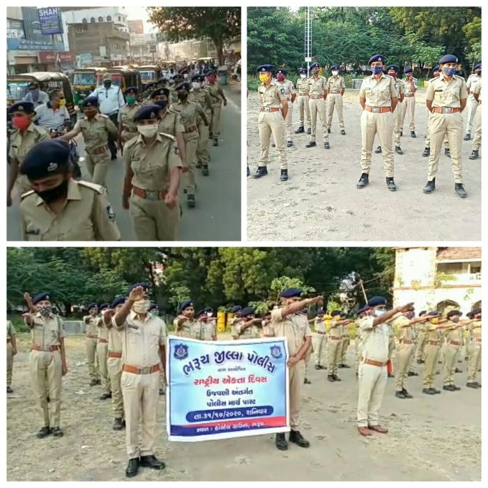 ભરૂચ પોલીસ તંત્ર દ્વારા એકતા શપથના પણ કાર્યક્રમ પોલીસ મથક ખાતે યોજાયા હતા પરંતુ રાષ્ટ્રીય એકતા દિવસ નિમિત્તે ભરૂચ પોલીસ તંત્ર દ્વારા યોજાયેલ એકતા માર્ચ પાસ્ટ દ્વારા એકતાનો ખાસ સંદેશ આપવામાં આવ્યો હતો એટલું જ નહીં પરંતુ આ કાર્યક્રમ દ્વારા ભરૂચ પોલીસ તંત્ર દ્વારા શિસ્ત, સંયમ, સભ્યતા અને સાથે અનુશાસન સાથે એકતાનો સંદેશ આપ્યો હતો જે નગરના હોસ્ટેલ ગ્રાઉન્ડ વિસ્તારમાં આકર્ષણનું કેન્દ્ર સાબિત થઈ હતી.