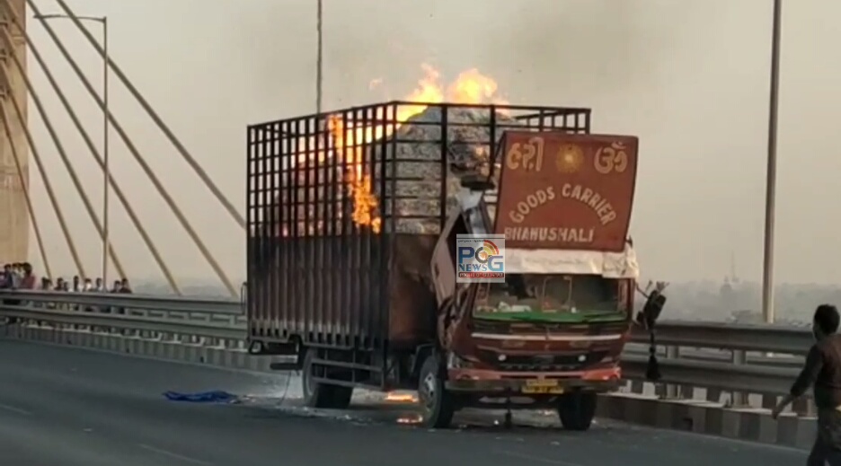 ભરૂચ નજીકથી પસાર થતાં રાષ્ટ્રીય ધોરી માર્ગ પર આવેલ નર્મદા નદી પરનાં કેબલ બ્રિજ પર પૂઠ્ઠા ભરેલ આઇસર ટેમ્પામાં અગમ્ય કારણોસર આગ ફાટી નીકળી હતી.