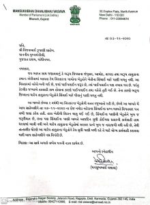ભરૂચના સાંસદ મનસુખ વસાવાએ ફરી એક સ્ફોટક પત્ર મુખ્યમંત્રીને લખ્યો…ભરૂચ જિલ્લાના ચાર તાલુકાના ખેડૂતોને સિંચાઈ અંગે પડતી સમસ્યા અંગે રજૂઆત કરી