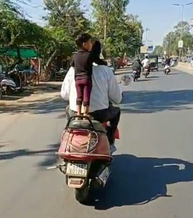 ભરૂચ પંથકમાં ઘણા બાઇક સવારો અવનવી પદ્ધતિથી રાઈડસ કરી પોતે આનંદ મેળવે છે સાથે સાથે રાહદારીઓને પણ આશ્રયમાં નાંખી દે છે આની સાથે સાથે લોકોનાં શ્વાસ અદ્ધર થઈ જાય છે ત્યારે પોલીસ દ્વારા કોઈ પગલાં લેવાયા નથી એ પણ એટલી નોંધપાત્ર બાબત છે. નાનકડાં બાળકને લઈને મોપેડ પર પિતા કે માતા લઈને નીકળે તેવા દ્રશ્યો સામાન્ય થઈ ગયા છે કેટલાક માતા-પિતા તો બાળકને ખભા પર બેસાડી ડે છે બાળક ચિચિયારીઓ પાડે અને બાળક મજા લે તેવા દ્રશ્યો તાજેતરમાં મોપેડ ચલાવતા પિતા કે સ્વજનનો વિડીયો વાઇરલ થયો છે જે કોઈપણ સેફટી સુવિધા વગર મોપેડ પર એક બાળકને ઊભો રાખી વાહન ચલાવે છે દેખીતી રીતે જ પિતા અને બાળકને આનંદ આવતો હોય તે સ્વભાવિક બાબત છે પરંતુ આપણે કોઈ નથી ઇચ્છતા પરંતુ જો પિતાનું કે બાળકનું બેલેન્સ ચૂકી જાય તો શું થાય … ?