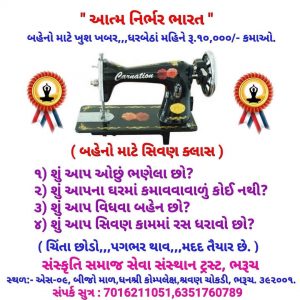 આત્મનિર્ભર ભારતનાં ભાગરૂપે ભરૂચની સંસ્કૃતિ સમાજ સેવા સંસ્થા ટ્રસ્ટ ભરૂચ દ્વારા બેરોજગાર બહેનોને રોજગારી થકી આત્મનિર્ભર બનાવવાના પ્રયાસો કરવામાં આવી રહ્યા છે.