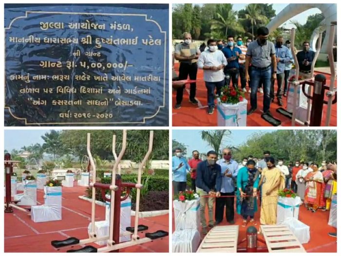 ભરૂચ જીલ્લા આયોજન મંડળ અને ધારાસભ્ય દુષ્યંત પટેલની ગ્રાન્ટમાંથી આજે ભરૂચ શહેરની મધ્યમાં આવેલા માતરીયા તળાવ ખાતે વિવિધ જગ્યાઓ પર હળવી અંગ કસરતનાં સાધનોનું રૂ.પાંચ લાખની ગ્રાન્ટથી લોકાર્પણ કરવામાં આવ્યું હતું.
