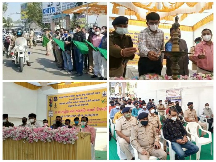 ભરૂચમાં આજે રાજકીય અગ્રણીઓ અને જીલ્લા પોલીસવડાની ઉપસ્થિતિમાં 32 માં રાષ્ટ્રીય માર્ગ સલામતી મહિનાની ઉજવણીનો પ્રારંભ કરવામાં આવ્યો હતો. એક મહિના દરમિયાન રાષ્ટ્રીય માર્ગ સલામતીની ઉજવણીનાં ભાગરૂપે ટ્રાફિક અને વાહન વ્યવહારનાં નિયમોનું પાલન કરવા માટે વિવિધ કાર્યક્રમો યોજાશે. આજના આ માર્ગ સલામતી માસની ઉજવણીનાં પ્રારંભે ભરૂચનાં ધારાસભ્ય દુષ્યંત પટેલ, પોલીસવડા રાજેન્દ્રસિંહ ચુડાસમા, બીજેપી પ્રમુખ મારૂતિસિંહ અટોદરીયા, એસ.ડી.એમ. બી.એચ પ્રજાપતિ, નગરપાલિકા ચીફ ઓફિસર સંજય સોની, આર.ટી.ઓ. ઈન્સ્પેકટર વિનુ મકવાણ, આર.ડી.એસ. જે.ડી.પટેલ સહિતનાં ભરૂચ નગરપાલિકા અને પાલિકા કર્મીઓ, અધિકારીઓ, પદાધિકારીઓ ઉપસ્થિત રહ્યા હતા.