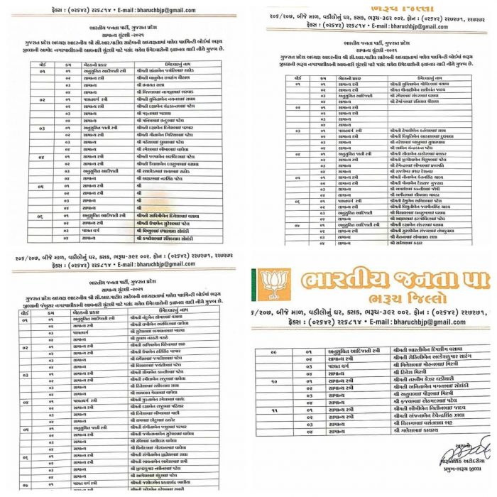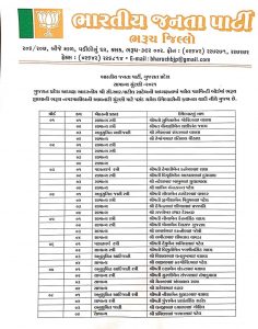 ભરૂચ જિલ્લાની ભરૂચ, અંકલેશ્વર, આમોદ, જંબુસર 4 પાલિકા, 1 જિલ્લા અને 9 તાાલુુુકા પંચાયત માટે બુુુધવારે મોડી રાતે ભારતીય જનતા પાર્ટીના ઉમેદવારો સત્તાવાર ફાઇનલ યાદી જાહેર કરાઈ હતી. ભરૂચ પાલિકા વોર્ડ 2, અંકલેશ્વર 8 અને આમોદ પાલિકા વોર્ડ 5 માટે ઉમેદવારોના નામ જાહેર કરાયા નથી. ભરૂચ જિલ્લાની સ્થાનિક સ્વરાજની ચૂંટણીમાં તમામ બેઠકો પર વિજય મેળવવાના ઉદ્દેશ્યથી ઉમેદવારોનું લિસ્ટ જાહેર કરવામાં આવ્યું છે. જેમાં કેટલીક જગ્યાઓ પર નવા ચહેરાનો તક આપવામાં આવી છે, તો કેટલીક બેઠકો પર અપેક્ષીત રીતે જુના ઉમેદવારોને રીપીટ કરવામાં આવ્યા છે.