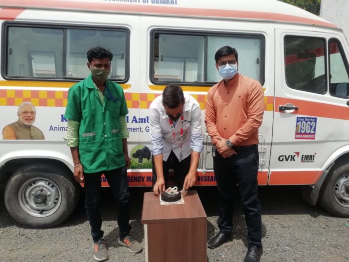 આજરોજ વર્લ્ડ વેટરીનરી ડે નિમિત્તે ૧૯૬૨ એનિમલ એમ્બ્યુલન્સનાં સ્ટાફ દ્વારા કેક કટ કરી ઉજવણી કરવામાં આવી.