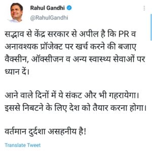 આ ટવીટમાં રાહુલ ગાંધીએ જણાવ્યુ હતું કે હાલનાં સમયમાં દેશમાં કોરોનાથી થતાં મૃત્યુમાં કાબૂ મેળવવાની આવશ્યકતા છે. તેમના મત મુજબ કેન્દ્ર સરકાર દ્વારા સરકારી દવાખાના હોસ્પિટલોમાં વધુને વધુ લોકોને સગવડતા આપવામાં આવે તે જરૂરી છે, અન્ય વધારાના વિષયમાં સરકાર દ્વારા ચર્ચા કરવામાં ન આવે તે ઉચિત રહેશે. હાલની કોરોના મહામારીમાં થતું સંક્રમણ અટકાવવાનાં સાવચેતીના પગલાં ભરવા અને સરકારે હોસ્પિટલમાં ઓક્સિજન બેડ, વેન્ટીલેટર, ઇન્જેકશન સહિતની સ્વાસ્થ્ય સંબંધી સેવાઓમાં વધારો કરવાની જરૂર છે. સરકાર દ્વારા પ્રોવિડન્ટ ફંડ કે બિનજરૂરી પ્રોજેકટમાં નાણાં અને સમયનો વેડફાટ કરવો જરૂરી નથી. આ તકે રાહુલ ગાંધીએ વધુમાં જણાવ્યુ હતું કે મીડિયાના મધ્યમથી જાણવા મળ્યું છે કે મહારાષ્ટ્ર, ગુજરાત જેવા અનેક રાજયોમાં સરકારી હોસ્પિટલોમાં ઓક્સિજન બેડ, વેન્ટીલેટર કે RTPCR જેવી લેબની પણ સુવિધાઓ નથી આથી રાહુલ ગાંધીએ એક ટવીટ કરી જણાવ્યુ હતું કે સરકારને હાલ કોરોના સામે જંગ જીતવાનો હોય સરકાર દ્વારા મૃત્યુ આંકમાં કંટ્રોલ મેળવવામાં આવે અને સ્વાસ્થય સંબંધિત સગવડતા વધુને વધુ લોકો પ્રાપ્ત કરી શકે તે આવશ્યક છે.