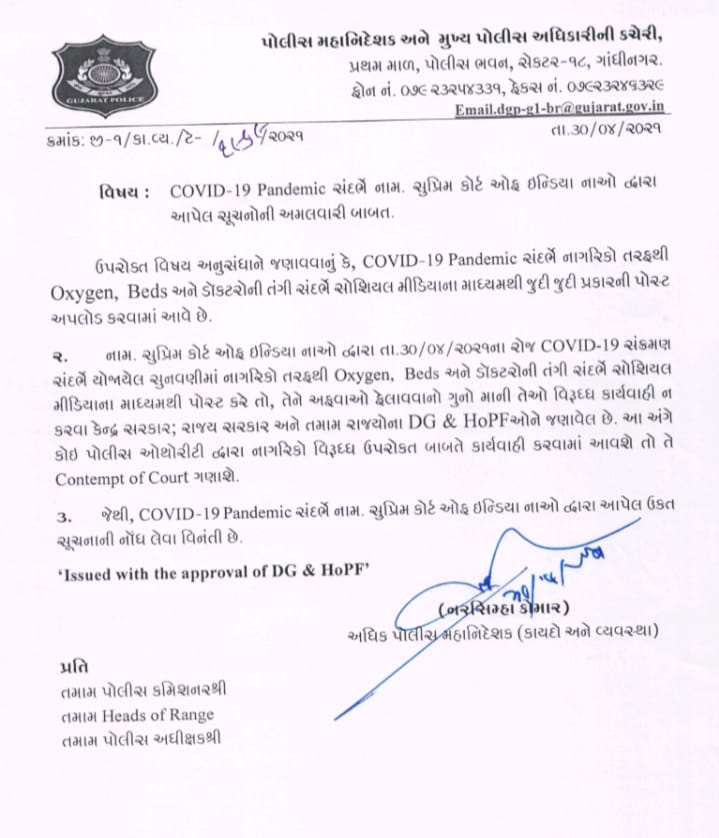 સુપ્રિમ કોર્ટ દ્વારા આપવામાં આવેલા આ આદેશોમાં જણાવાયું છે કે કોવિડ-19 નાં સંદર્ભમાં નાગરિકો દ્વારા જો ઑક્સીજન બેડ, ડોકટર અને સ્ટાફની તંગી કે અન્ય કોઈપણ પ્રકારનાં ચિત્રો કે મહામારીની સ્થિતિ દર્શાવતી પોસ્ટ, કોવિડ-19 નાં સંક્રમણનાં સંદર્ભમાં હોય તો આ પ્રકારની પોસ્ટ સોશિયલ મીડિયા ફેસબુક, ઇનસ્ટા, વોટસએપ કે અન્ય માધ્યમોમાં ફરતી પોસ્ટને અફવા ન માનવી અને આ પ્રકારની પોસ્ટ એ કોઈ ગુનો નથી, જો આવી કોઈપણ પોસ્ટ સોશિયલ મીડિયામાં ફરતી હોય, વહેતી કરી હોય તો તેવા કોઈપણ આસામી પર પોલીસ કે સરકાર દ્વારા શિક્ષાત્મક પગલાં લેવામાં આવશે નહીં અને જો પોલીસ દ્વારા આ પ્રકારનાં કેસ નોંધવામાં આવશે તો તેને કન્ટેમ્પટ ઓફ કોર્ટ કહેવામા આવશે આથી આજે આ માહિતી ગુજરાત રાજયનાં પોલીસ મહાનિર્દેશક અને મુખ્ય પોલીસ અધિકારી દ્વારા તમામ જિલ્લા મથકોમાં પરિપત્ર પાઠવી કાયદો અને વ્યવસ્થા જળવાય રહે તેવી અપીલ કરવામાં આવી હતી.