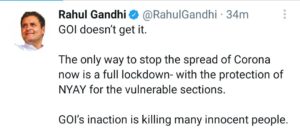 રાહુલ ગાંધીએ પોતાની ટવીટમાં જણાવ્યુ છે કે ભારતનાં વિવિધ રાજયોમાં કોરોનાનું સંક્રમણ સતત વધતું જાય છે. ગુજરાત, મહારાષ્ટ્ર, કેરાલા, દિલ્લી સહિતનાં ભારતના રાજયોમાં કોરોના સંક્રમિતની સંખ્યામાં દિન-પ્રતિદિન વધારો થતો જયા છે તો મૃત્યુઆંક પણ સતત ઊંચો થતો જાય છે આથી આગામી સમયમાં ભારત સરકાર દ્વારા આ મોતનું તાંડવ ખેલાતું બંધ કરવા માટે સંપૂર્ણ લોકડાઉન કરવું જરૂરી છે.