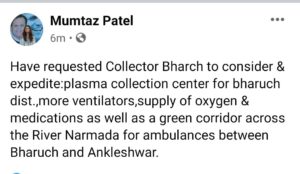 અહેમદ પટેલનાં પુત્રી મુમતાઝ પટેલ દ્વારા ભરૂચમાં કોવિડ-19 ની સ્થિતિને ધ્યાને લેતા ભરૂચનાં કલેકટરને ઇલેકટ્રોનિક માધ્યમ દ્વારા પ્લાઝમા કલેકશન સેન્ટરની શરૂઆત કરવાની રજૂઆત કરાઇ છે તેમજ ભરૂચનાં દર્દીઓને વેન્ટીલેટર,ઓક્સિજન તાત્કાલિક મળી રહે તે માટે એમ્બ્યુલન્સને ભરૂચ-અંકલેશ્વર વચ્ચે ગ્રીન કોરિડોર આપવાની પણ જનતા માટે આ તકે માંગણી કરી છે.