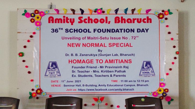 ભરૂચ સ્થિત આવેલ એમિટી સ્કૂલ જેમાં 36 વર્ષથી મોટી સંખ્યામાં વિદ્યાર્થીઓ ગુજરાતી માધ્યમ અને અંગ્રેજી માધ્યમમાં ભણી ચુક્યા છે અને હાલ ભણી રહ્યા છે તે દિવસની આજરોજ ઉજવણી કરવામાં આવી હતી. ફાઉન્ડર રણછોડ શાહ દ્વારા શરૂ કરવામાં આવેલ એમિટી સ્કૂલને આજરોજ 36 વર્ષ પૂર્ણ થયા છે, અને સાથે સ્ટાફ અને ટ્રસ્ટ દ્વારા શાળાનું નામ રોશન કરવામાં આવ્યું છે.