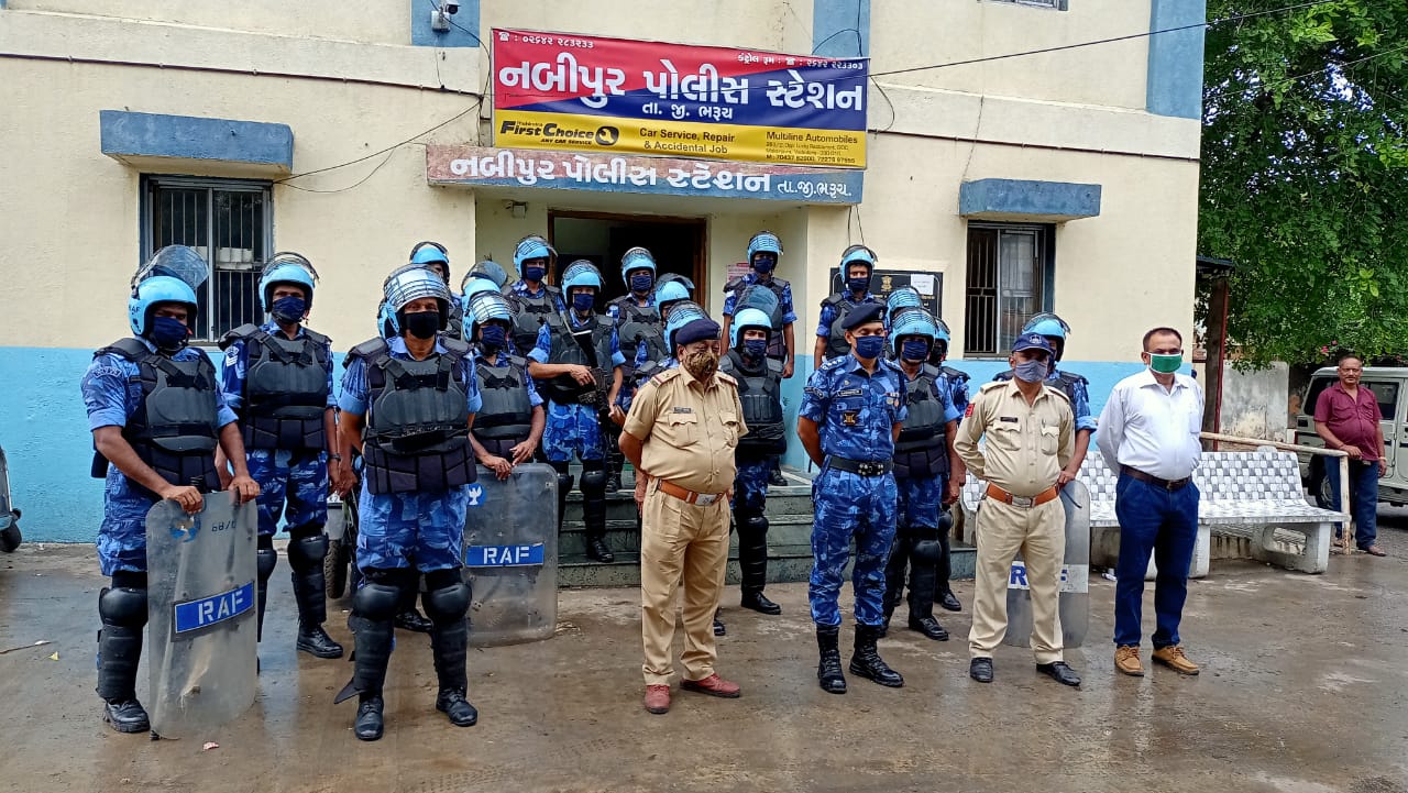 ભરૂચ તાલુકાના નબીપુર પોલીસ એ/ ૧૦૦ આર.એ.એફ. અમદાવાદના વસ્ત્રાલ, રઘુવીરસિંઘની લડા ક્રમ આર.એ.એફ. ના નેતૃત્વમાં ભરૂચ જિલ્લાની ઓળખાણ માટે અભ્યાસ કરવા માટે આવ્યો છે. જિલ્લાના વિવિધ પોલીસ મથકોની મુલાકાત લેવામાં આવી રહી છે, તેમજ જિલ્લા પોલીસ સાથે મળીને ફ્લેગ માર્ચ પણ યોજવામાં આવી રહી છે.
