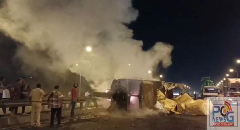 બનાવ અંગેની પ્રાપ્ત માહિતી અનુસાર ભરૂચના ને.હા ૪૮ પર આવેલ સ્વામિનારાયણ મંદિર પાસે ગત રાત્રીના સમયે એક ટ્રકને અકસ્માત નડતા તે પલ્ટી મારી હતી જે બાદ અચાનક ટ્રકની અંદરના ભાગે સ્પાર્ક થતા જોતજોતામાં આગ ભભૂકી ઉઠતા ભારે નાસભાગના દ્રશ્યો સર્જાયા હતા.