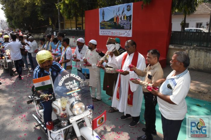 રાષ્ટ્રીય એકતા દિવસની ઉજવણીના ભાગરૂપે કચ્છના લખપતથી શરૂ થયેલ બાઈક રેલી આજે ભરૂચના ઝાડેશ્વર ખાતે સાંઈ મંદિરે આવી પહોંચતા ભરૂચના ધારાસભ્ય અને નાયબ મુખ્ય દંડક દુષ્યંતભાઈ પટેલ, જિલ્લા આગેવાન મારૂતિસિંહ અટોદરીયા, જિલ્લા પંચાયતના સભ્ય શૈલાબેન પટેલ, નાયબ કલેક્ટર એન.આર.પ્રજાપતિ સહિત આગેવાન પદાધિકારીઓ, ગામ આગેવાનો, પોલીસ કર્મચારીઓ ધ્વારા ફુલ-હારથી બાઈક સવારોનું ભવ્ય સ્વાગત કરવામાં આવ્યું હતું. ત્યારબાદ બાઈક રેલી આગળ ધપતાં ઉન્નતિ વિદ્યાભવન, મક્તમપુર કૃષિ કોલેજ, કર્મઠ ગૃપ કસક ફુવારા પાસે, ભોલાવ બ્રીજની નીચે બાઈક સવારોનું ફુલ-હાર પહેરાવી સ્વાગત કરાયું હતું.