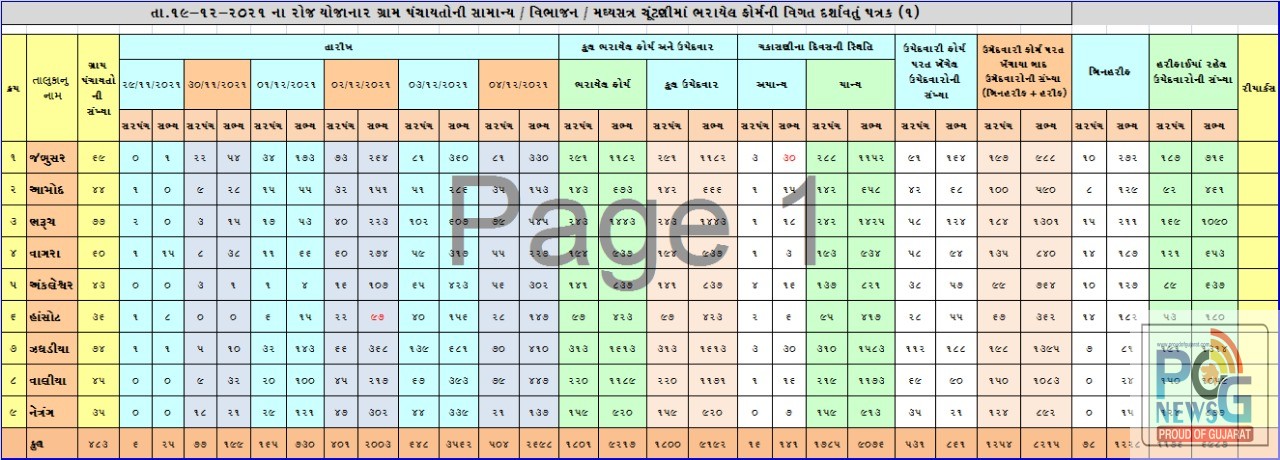 ભરૂચ જિલ્લામાં આગામી તા.૧૯ મી ડીસેમ્બરે ભરૂચ જિલ્લાના નવ તાલુકાઓમાં કુલ ૪૮૩ ગ્રામ પંચાયતની ચૂંટણી યોજાનાર છે. જેમાં સંપૂર્ણ બિનહરિફ એટલે કે સમરસ થયેલ 62 ગ્રામ પંચાયતો 62 ગામોની વિગત જોતા ભરૂચ જિલ્લાના ઝઘડીઆ તાલુકામાં ૭૪ ગ્રામ પંચાયતોની ચૂંટણીમાં ૭ ગામ સમરસ થયેલ છે. જેમાં વંઠેવાડ, મોટાવાસણા, નાનાવાસણા, ઉચ્છબ, ધારોલી, ઓર-પટાર ગૃપ, જેશપોર ગૃપ ગામોનો સમાવેશ થાય છે.