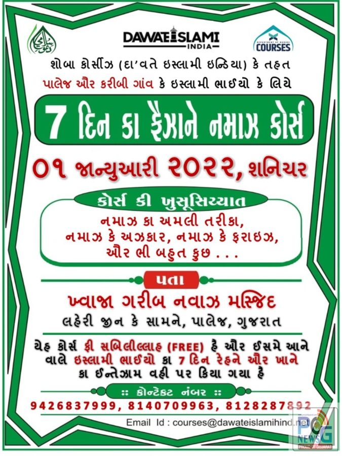ભરૂચ જિલ્લાના પાલેજ ખાતે લહેરી જીન સામે આવેલી મસ્જિદમાં દાવતે ઇસ્લામી દ્વારા નમાઝ માટે સાત દિવસીય પ્રશિક્ષણ સેમિનાર યોજાશે. આયોજિત સેમિનારમાં નમાઝના તમામ અરકાનો વિશે સંપૂર્ણ છણાવટ સાથે પ્રશિક્ષણ આપવામાં આવશે. આગામી પહેલી જાન્યુઆરીથી સાત દિવસ માટે પ્રશિક્ષણ સેમિનાર યોજાશે.