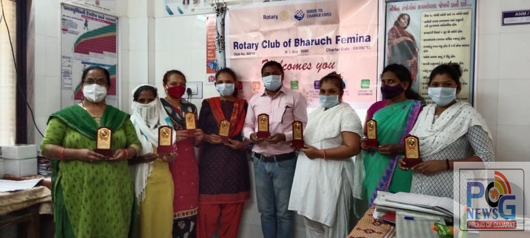 ભરૂચના મકતમપુર આરોગ્ય કેન્દ્રના કર્મચારીઓ દ્વારા કોરોના કાળ દરમિયાન તથા વેક્સિનેશનની કામગીરી સફળતાપૂર્વક કરવા બદલ રોટરી ક્લબ ફેમિના ગ્રુપ દ્વારા ધારાસભ્યના હસ્તે તમામ કર્મચારીઓને સન્માનીત કરવામાં આવ્યા હતા.