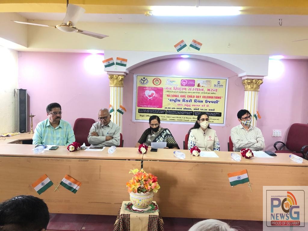 આજરોજ જન શિક્ષણ સંસ્થાન ભરૂચ ખાતે મધ્યસ્થ ખંડમાં આઝાદી કા અમૃત મહોત્સવ હેઠળ રાષ્ટ્રિય દિકરી દિવસની ઉજવણી નગર પ્રાથમિક શિક્ષણ સમિતિનાં અધ્યક્ષ અને આ સંસ્થાનના બોર્ડ મેમ્બર ભરૂચ જિલ્લા ભાજપના મહિલા મોરચાનાં ઉપપ્રમુખ ઇન્દિરાબેન રાજનાં અધ્યક્ષ પદે કરવામાં આવી.