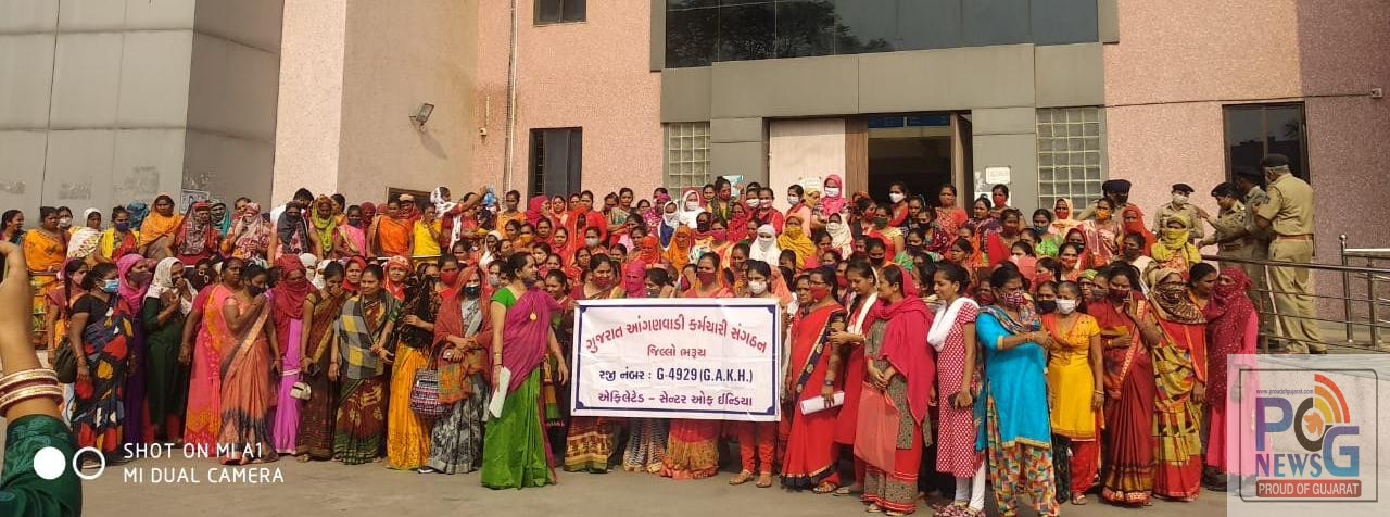 તો બીજી તરફ ગુજરાત રાજ્ય મહિલા આંગણવાડી સંગઠનના રાગીણી સિંહ પરમારની આગેવાનીમાં આંગણવાડી અને આશા વર્કરની બહેનોએ પણ આજે બપોરે ચાર કલાકે કલેક્ટર સમક્ષ આવેદનપત્ર આપવાનો એક કાર્યક્રમ યોજ્યો હતો, જેમાં દેશનઆ અન્ય રાજ્યોમાં આંગણવાડી કર્મચારીઓને જે પગાર ભથ્થું મળે છે તેના કરતાં ઓછું ગુજરાતમાં મળતું હોવાના આક્ષેપો આવેદનપત્રમાં કરવામાં આવ્યા છે સાથે નિવૃત વય મર્યાદા ૬૦ ઉપર છે, રાજ્યમાં આંગણવાડી, આશા વર્કર, ફેસીલીએટર, મધ્યાહ્નન ભોજન વર્કરોને કામના કલાકો કાગળ ઉપર અલગ છે અને પ્રેક્ટીકલ વધારે છે, વેતનની સમાનતાનો અમલ નથી. બાંધકામ ક્ષેત્રે પણ મહિલા વર્કરોને પુરુષ વર્કર કરતા ઓછું વેતન અપાય છે, સાથે જ છેલ્લા ૬ માસમાં મહિલાઓ ઉપર થયેલા અત્યાચારો જેવી બાબતોને આવેદનપત્રમાં સમાવી લઈ રજૂઆત કરવામાં આવનાર છે, અને રાજ્ય સરકાર તમામ બાબતોમાં તાકીદે નિર્ણયો કરી યોગ્ય જાહેરાત કરશે તેવી આશા વ્યક્ત કરી હતી.