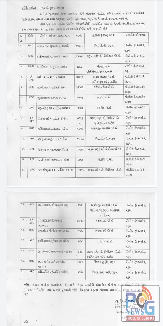 લોકલ ક્રાઈમ બ્રાન્ચ, ભરૂચ એ, બી, સી ડિવિઝન, અંકલેશ્વર GIDC, દહેજ મરીન, રાજપારડી, આમોદ, હાંસોટ, જિલ્લા ટ્રાફિક અને પેરોલ ફ્લો સ્કવોર્ડમાં હાલ ફરજ બજાવતા 20 પોલીસ કર્મચારીઓને હેડ કવાટર્સના હવાલે કરી દેવાયા છે. હેડ કવાટર્સમાં 20 પોલીસ જવાનોની સામુહિક બદલી કરી તેઓની હાજરી રોલકોલ માટે પણ જે તે અધિકારીને સૂચન કરાયું છે. જો બદલી કરાયેલ પોલીસ જવાન હેડ કવાટર્સ ઉપર ગેરહાજર રહે તો તે અંગે પણ રિપોર્ટ કરવા પોલીસ અધિક્ષકે તાકીદ કરી છે.